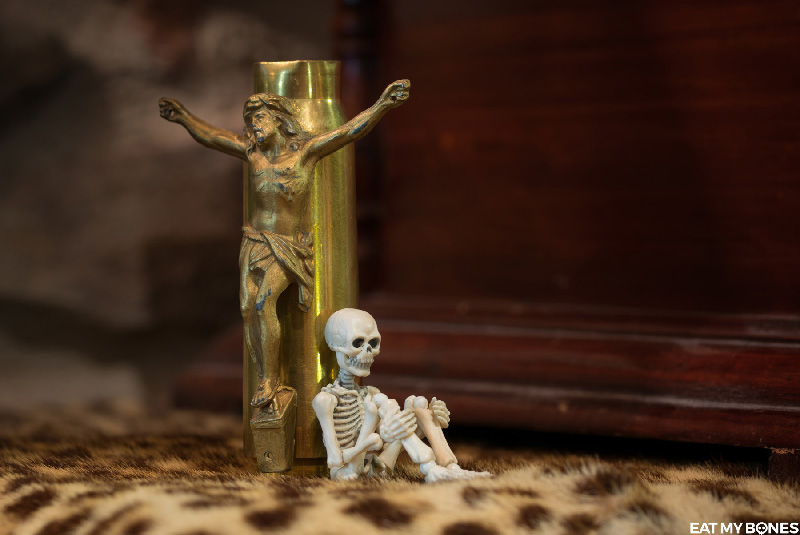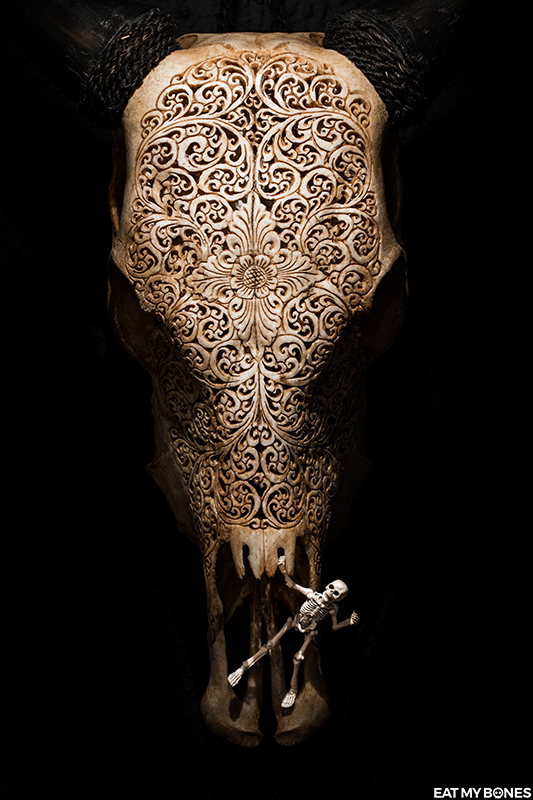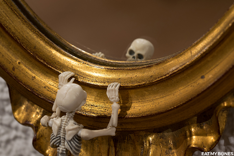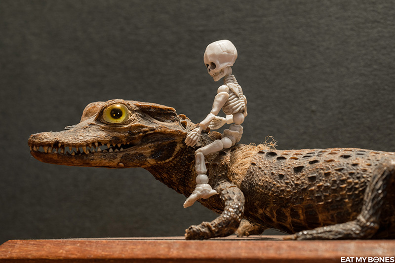Quel meilleur thème que le cabinet de curiosités pour une famille de squelettes ne cherchant qu’à découvrir le monde en s’amusant ? En confrontant, dans une ambiance rétro, mes figurines et des objets de curiosités ou des animaux empaillés, plongeons ensemble dans un monde étrange, de manière ludique.